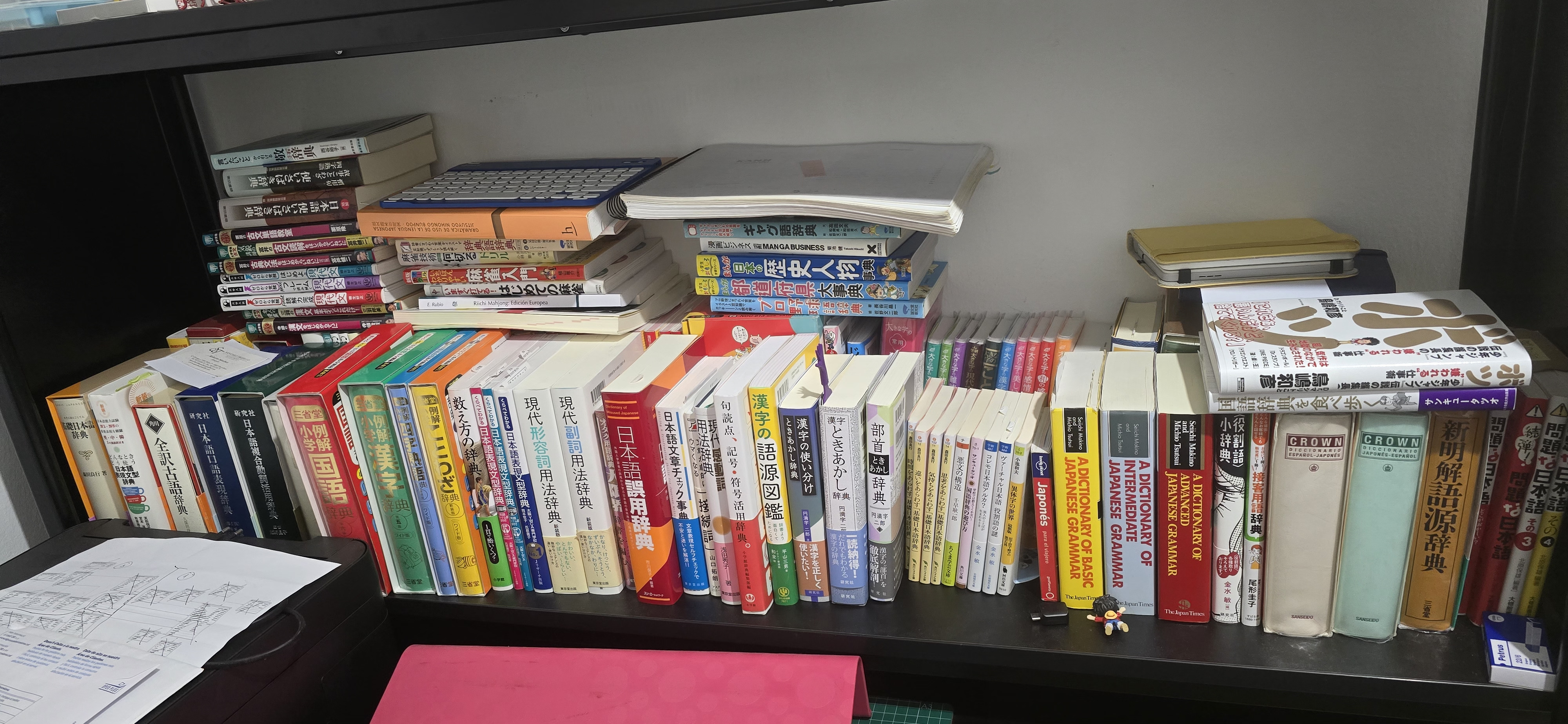 No tiene nada que ver con la finalidad del hilo, pero os presento mi colección de diccionarios japoneses, sólo me falta un mueble nuevo donde realojarlos que están apretujaditos.